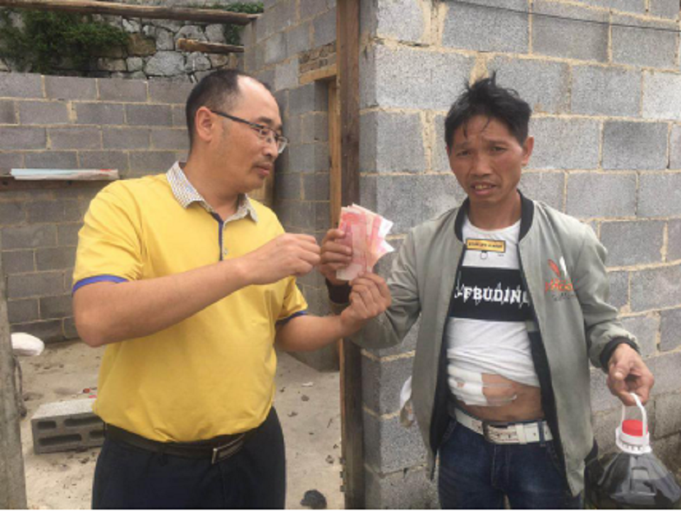 圖為公司董事長楊景龍為陳玉坤送去食用油和慰問金。