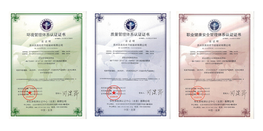 2018年10月23日,貴州西奧輕質節能板材有限公司順利取得質量、環境、職業健康安全管理“三體系”證書!這標志著貴州西奧綜合管理水平上升到一個新的臺階,已經與國際水準接軌,對于增強企業內部管理力、外部競爭力都具有重要意義。