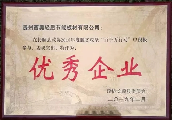 2月24日,政協長順縣第九屆委員會第三次會議上,貴州西奧輕質節能板材有限公司等11家委員企業被表彰為長順縣政協2018年度脫貧攻堅“百千萬行動”優秀企業。