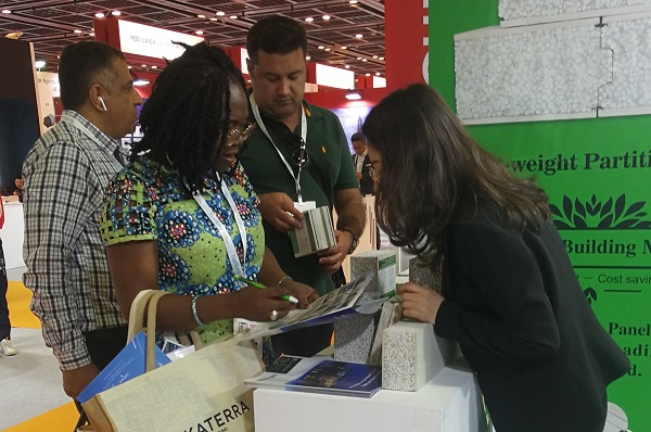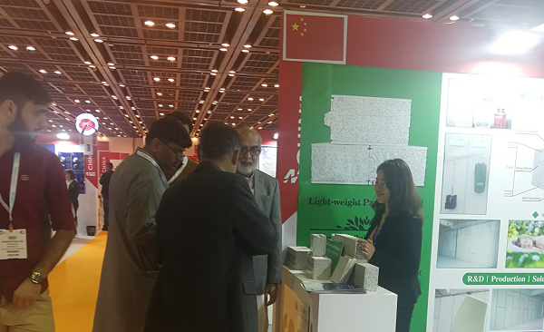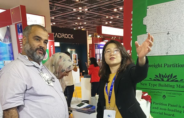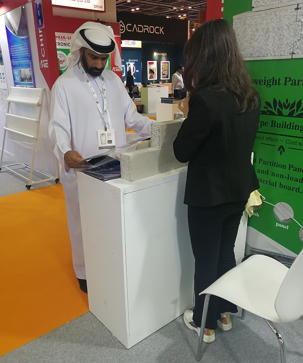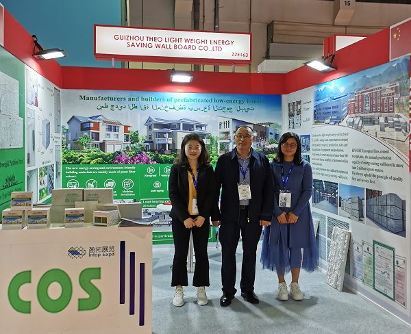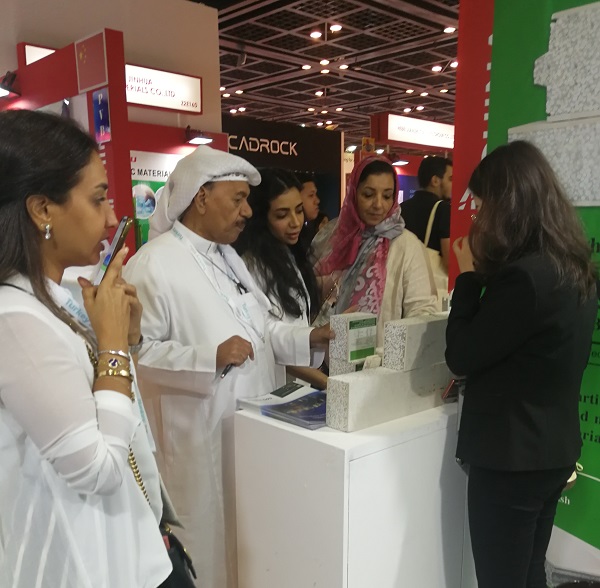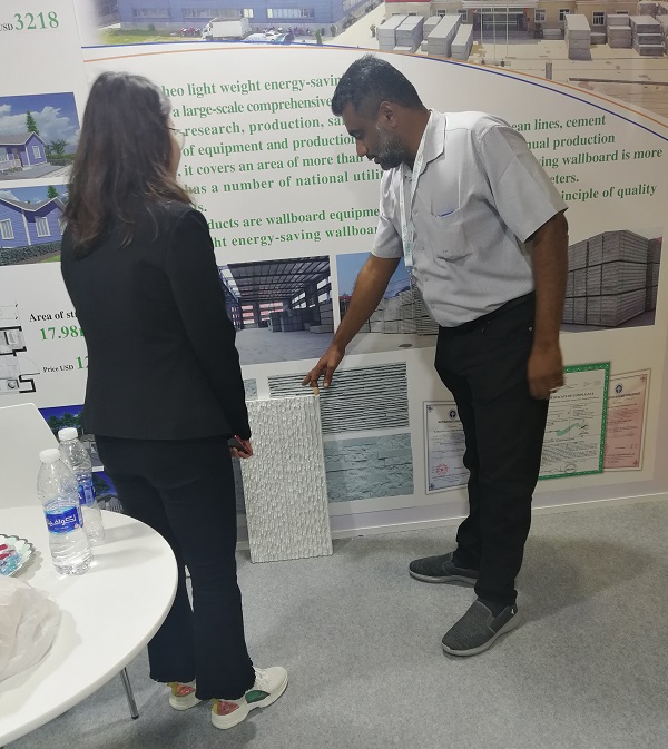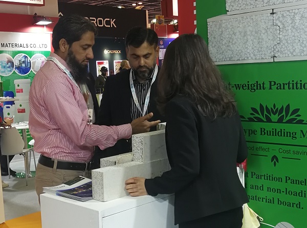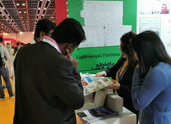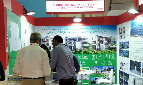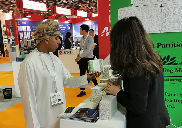 本次展會上,西奧集團的系列“綠色建材”產品備受關注。展示樣品,詳細向參觀者介紹了用植物纖維等綠色材料為原料的快速裝配式別墅、可以漂浮在水上的防火性能優異的輕質節能墻板、仿天然石材的彩色GRC等系列產品。這些新穎的建材產品,無疑引來參觀者的好奇。面對參觀者提出的各種問題,西奧海外事業部的員工用英語一一進行了解答,產品的優異性能更得到參觀者的肯定。
