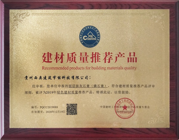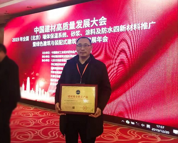 12月19-21日,“2019年全國(北京)墻體保溫系統、砂漿、涂料及防水四新材料推廣暨綠色建筑與裝配式建筑選材發展年會”在北京召開。會上,貴州西奧的磷石膏抹灰砂漿經審核,被評為“2019年綠色建材質量推薦產品”。