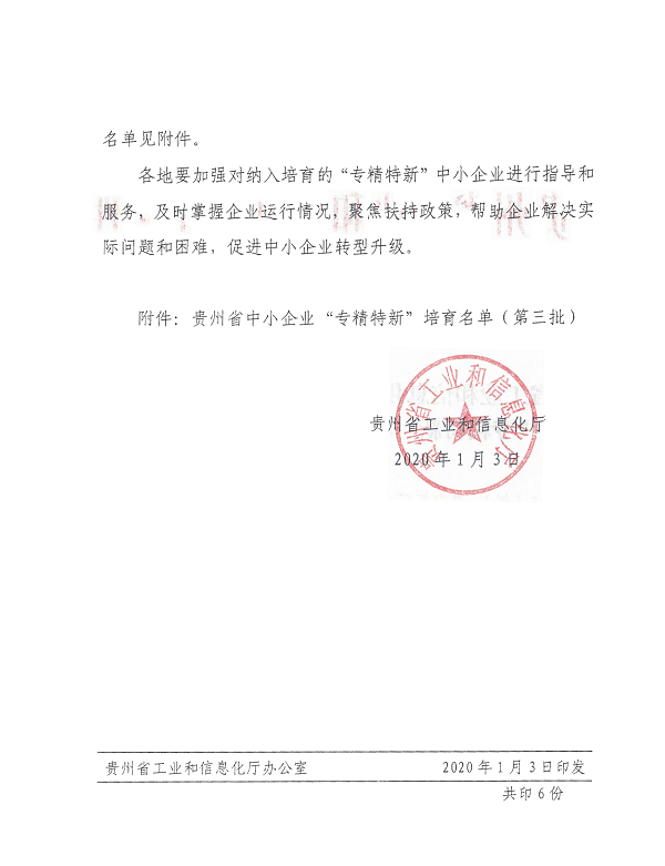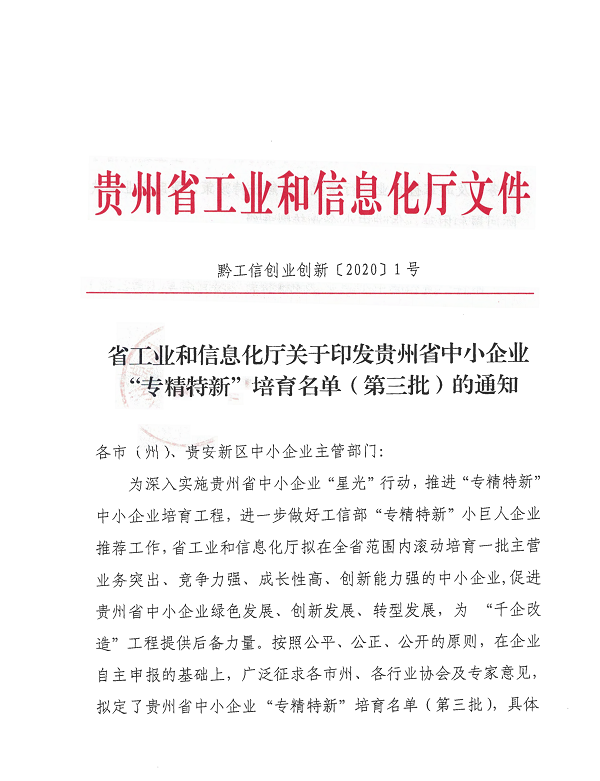 為深入實施貴州省中小企業(yè)“星光”行動,推進“專精特新”中小企業(yè)培育工程,進一步做好工信部“專精特新”小巨人企業(yè)推薦工作,貴州省工信廳在全省范圍內(nèi)滾動培育一批主營業(yè)務突出、競爭力強、成長性高、創(chuàng)新能力強的中小企業(yè),促進貴州省中小企業(yè)綠色發(fā)展、創(chuàng)新發(fā)展、轉型發(fā)展,為 “千企改造”工程提供后備力量。按照公平、公正、公開的原則,在企業(yè)自主申報的基礎上,廣泛征求各市州、各行業(yè)協(xié)會及專家意見,擬定了貴州省中小企業(yè)“專精特新”培育名單。