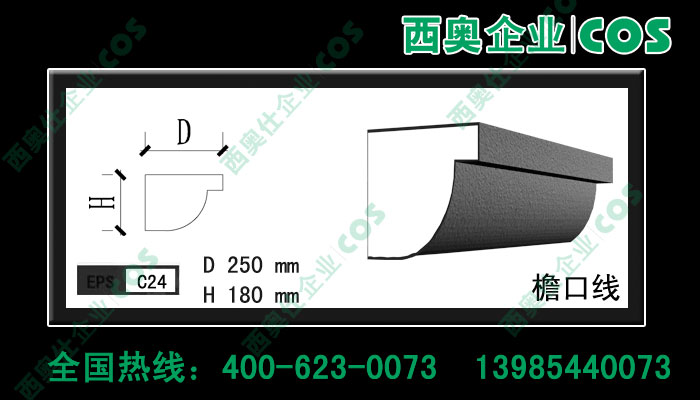 西奧仕(COS)EPS裝飾線條、構件是由脫模B2級防火的聚笨乙烯為主體,粘貼耐堿玻纖網格布,加以特殊的粘結外保護層復合而成
