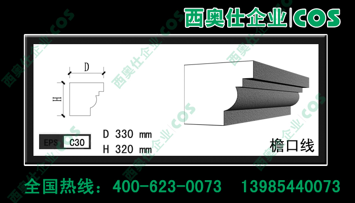 西奧仕(COS)EPS裝飾線條、構(gòu)件是由脫模B2級(jí)防火的聚笨乙烯為主體,粘貼耐堿玻纖網(wǎng)格布,加以特殊的粘結(jié)外保護(hù)層復(fù)合而成