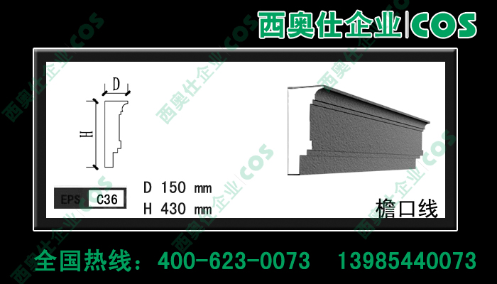 西奧仕(COS)EPS裝飾線條、構件是由脫模B2級防火的聚笨乙烯為主體,粘貼耐堿玻纖網格布,加以特殊的粘結外保護層復合而成