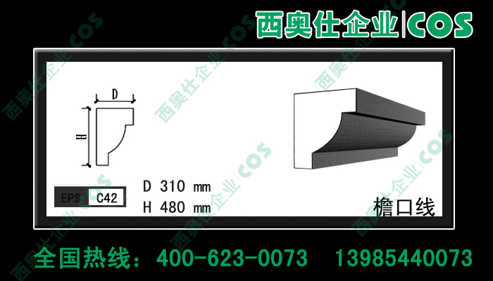 西奧仕(COS)EPS裝飾線條、構件是由脫模B2級防火的聚笨乙烯為主體,粘貼耐堿玻纖網格布,加以特殊的粘結外保護層復合而成