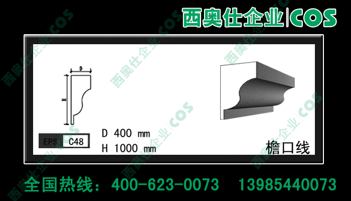 西奧仕(COS)EPS裝飾線條、構(gòu)件是由脫模B2級(jí)防火的聚笨乙烯為主體,粘貼耐堿玻纖網(wǎng)格布,加以特殊的粘結(jié)外保護(hù)層復(fù)合而成