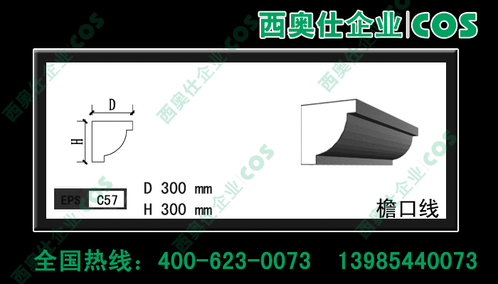 西奧仕(COS)EPS裝飾線條、構件是由脫模B2級防火的聚笨乙烯為主體,粘貼耐堿玻纖網格布,加以特殊的粘結外保護層復合而成