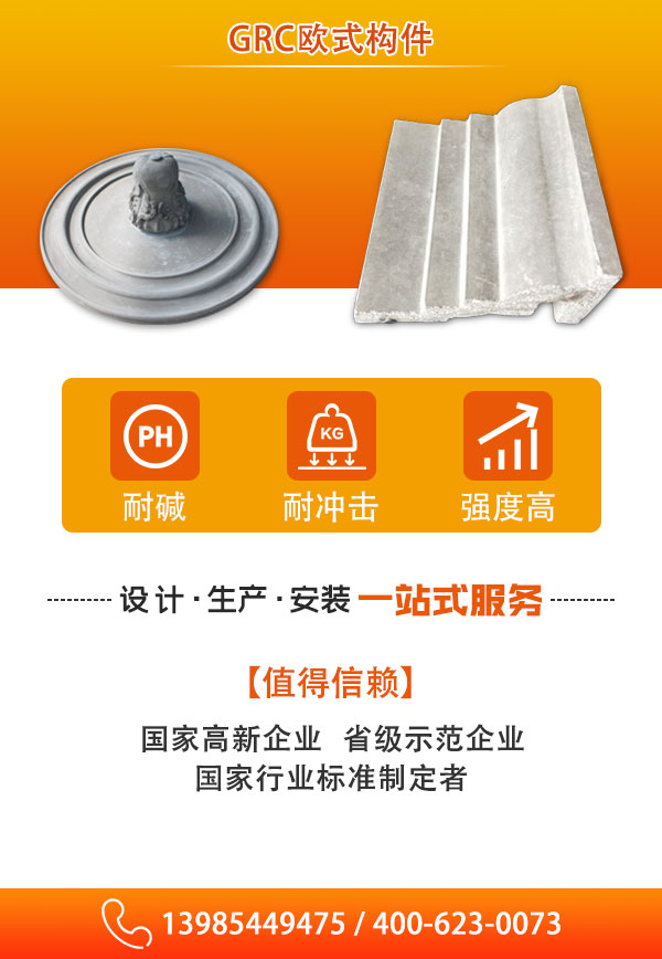 主要用于建筑細(xì)部裝飾構(gòu)件、幕墻板、外墻掛板、舊樓改造及GRC園林景觀制品等。有歐式裝飾柱、各種檐線、門窗頂套、門窗線套、裝飾花飾、仿真石材六類,可以按圖紙定做。