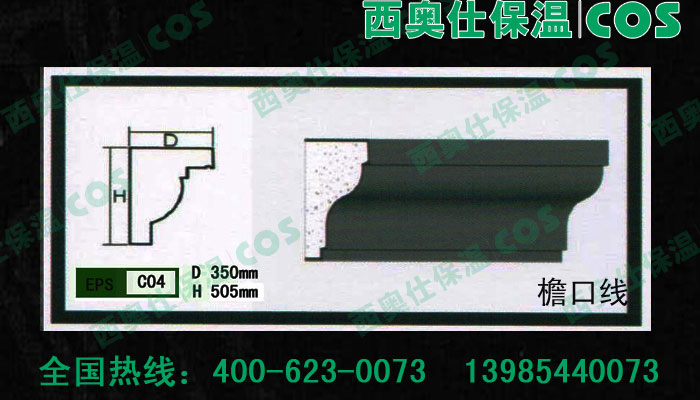 西奧仕(COS)EPS裝飾線條、構件是由脫模B2級防火的聚笨乙烯為主體,粘貼耐堿玻纖網格布,加以特殊的粘結外保護層復合而成