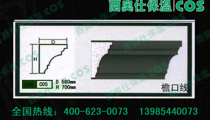 西奧仕(COS)EPS裝飾線條、構(gòu)件是由脫模B2級(jí)防火的聚笨乙烯為主體,粘貼耐堿玻纖網(wǎng)格布,加以特殊的粘結(jié)外保護(hù)層復(fù)合而成