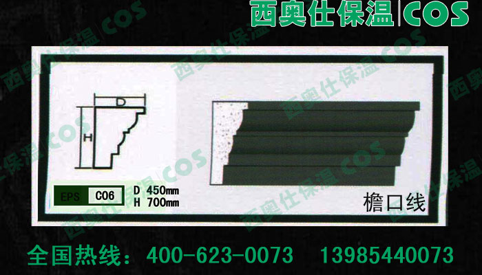 西奧仕(COS)EPS裝飾線條、構件是由脫模B2級防火的聚笨乙烯為主體,粘貼耐堿玻纖網格布,加以特殊的粘結外保護層復合而成