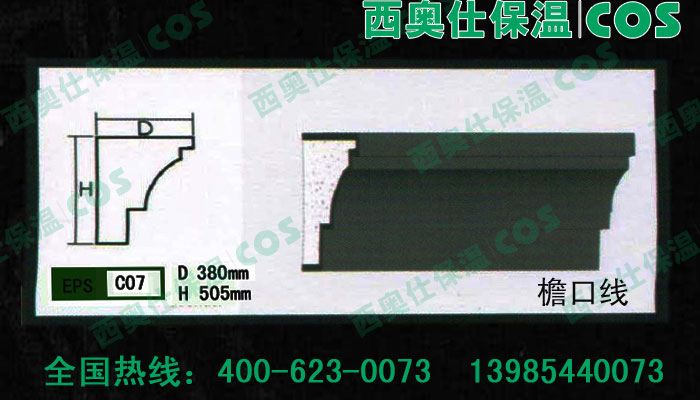 西奧仕(COS)EPS裝飾線條、構件是由脫模B2級防火的聚笨乙烯為主體,粘貼耐堿玻纖網格布,加以特殊的粘結外保護層復合而成