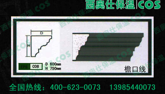 西奧仕(COS)EPS裝飾線條、構(gòu)件是由脫模B2級(jí)防火的聚笨乙烯為主體,粘貼耐堿玻纖網(wǎng)格布,加以特殊的粘結(jié)外保護(hù)層復(fù)合而成
