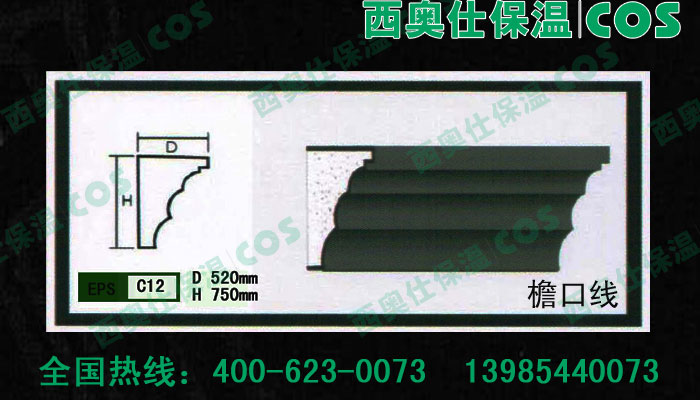 西奧仕(COS)EPS裝飾線條、構件是由脫模B2級防火的聚笨乙烯為主體,粘貼耐堿玻纖網格布,加以特殊的粘結外保護層復合而成