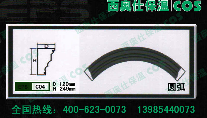 西奧仕(COS)EPS裝飾線條、構件是由脫模B2級防火的聚笨乙烯為主體,粘貼耐堿玻纖網格布,加以特殊的粘結外保護層復合而成