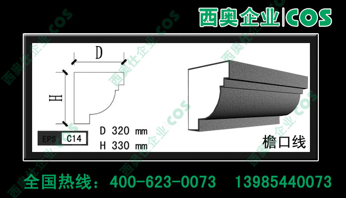 西奧仕(COS)EPS裝飾線條、構件是由脫模B2級防火的聚笨乙烯為主體,粘貼耐堿玻纖網格布,加以特殊的粘結外保護層復合而成