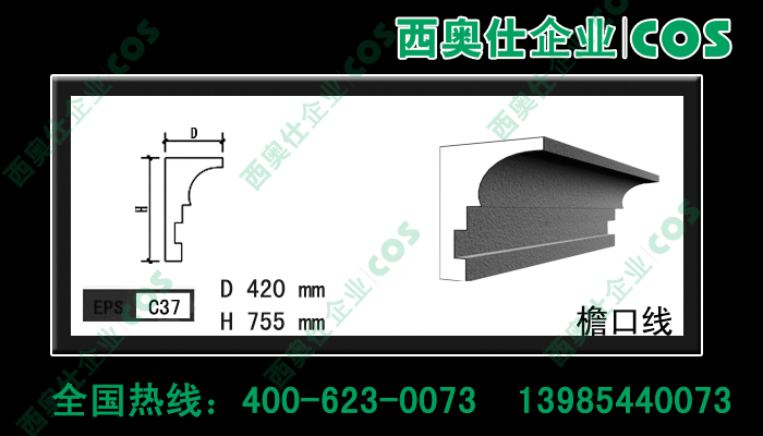 西奧仕(COS)EPS裝飾線條、構件是由脫模B2級防火的聚笨乙烯為主體,粘貼耐堿玻纖網格布,加以特殊的粘結外保護層復合而成