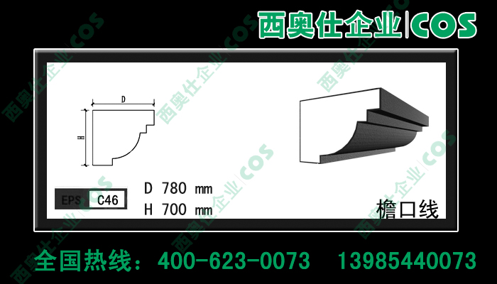 西奧仕(COS)EPS裝飾線條、構(gòu)件是由脫模B2級防火的聚笨乙烯為主體,粘貼耐堿玻纖網(wǎng)格布,加以特殊的粘結(jié)外保護層復(fù)合而成