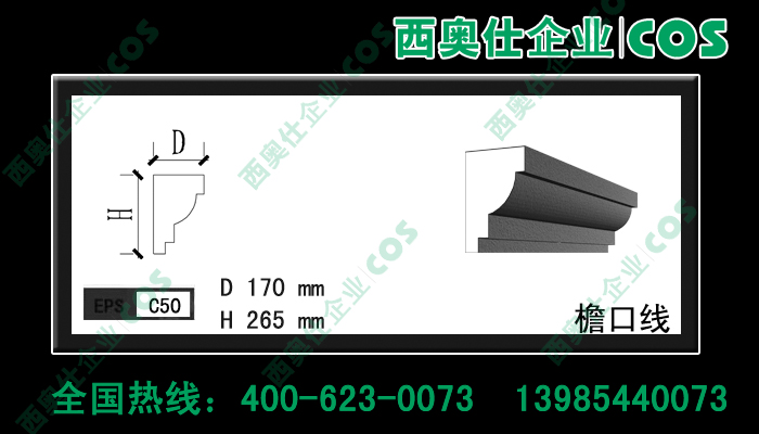 西奧仕(COS)EPS裝飾線條、構件是由脫模B2級防火的聚笨乙烯為主體,粘貼耐堿玻纖網格布,加以特殊的粘結外保護層復合而成
